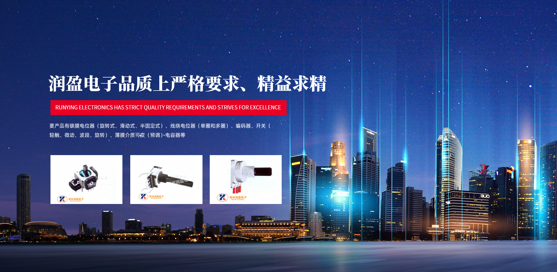 主要產(chǎn)品有碳膜電位器(旋轉(zhuǎn)式、滑動式、半固定式)、線繞電位器(單圈和多圈)、編碼器、開關(guān)(輕觸、微動、波段、旋轉(zhuǎn))、薄膜介質(zhì)可變(預(yù)調(diào))電容器等